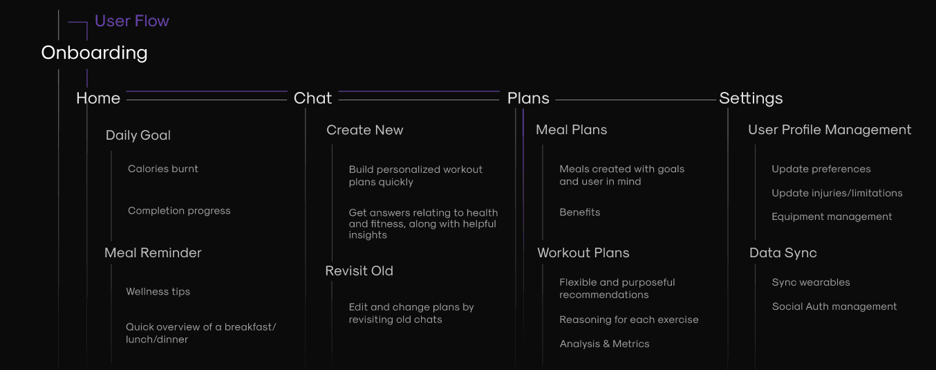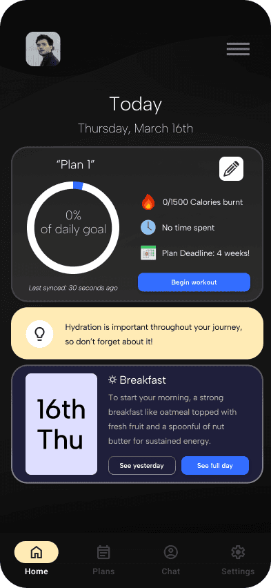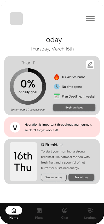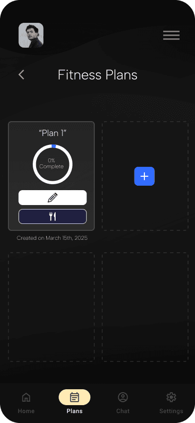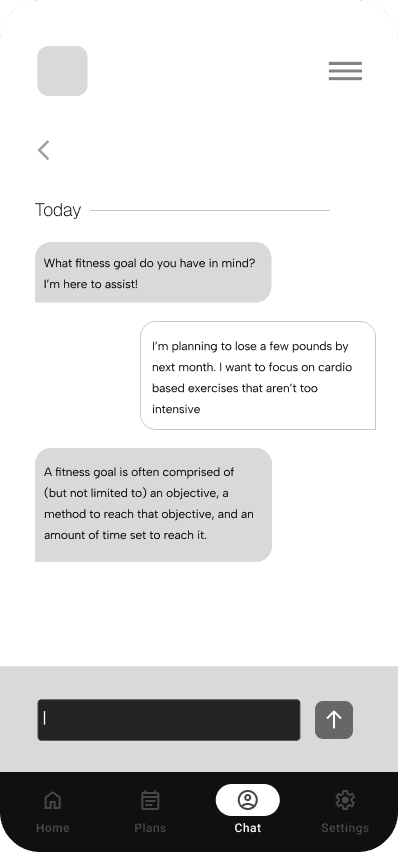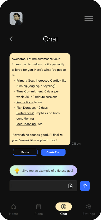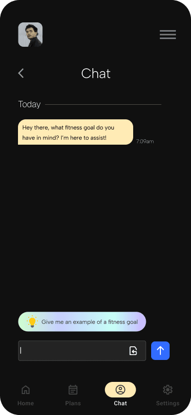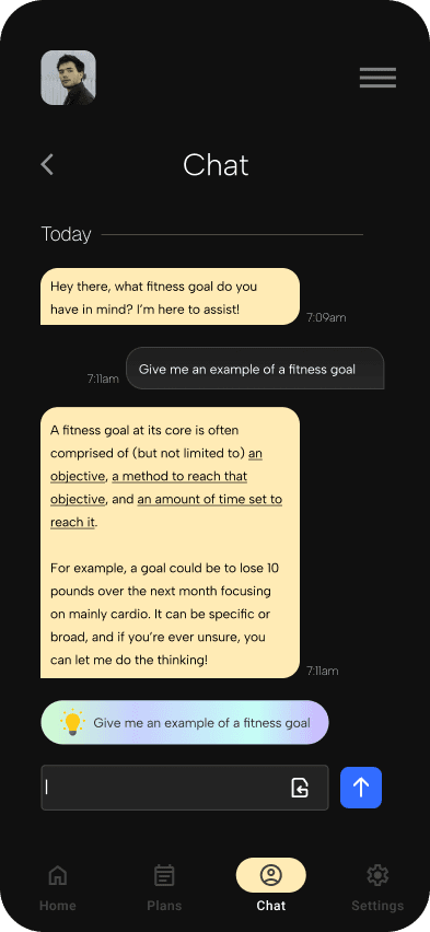 An ideation of an AI-assisted fitness goal planner for workout and meal preparation, adaptive to specific user needs, wants, and conditions.