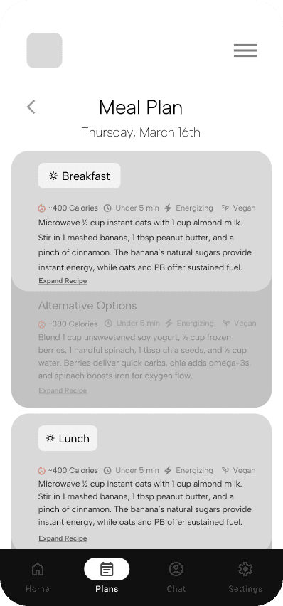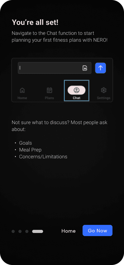 Users weren't sure where to begin when asking NERO to create plans. For the prototype, they didn't have to, but it showed a potential mental block. Therefore, a button that provides an example plan helps give them ideas.