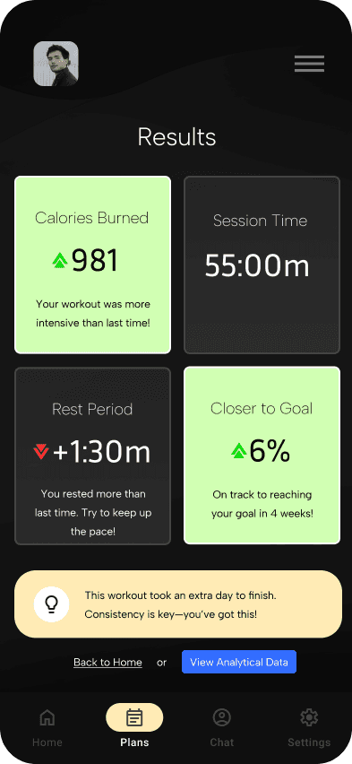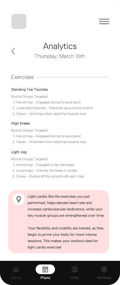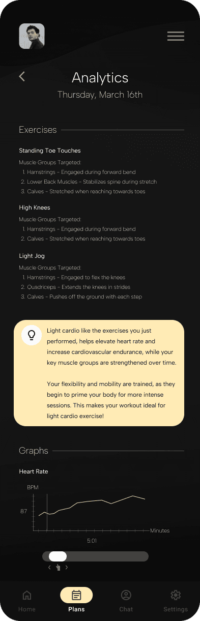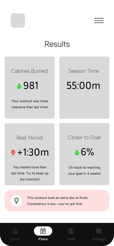 Competence is a measure of our own "capability", measured by how well we perform a task in relation to the effort put in. Though, I believe the highest feelings of competence stems from understanding how and why a task was done, rather than just completing it. Therefore, the results page is designed for reinforcing understanding. Data, whether biological or quantitative of a user's finished workout, can help them discover why their workout was successful.