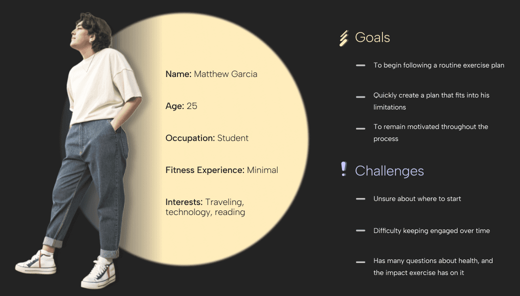 Ultimately, the potential user is someone who has no proper guidance, but wants to build confidence to reach their fitness objective. Below, this persona captures the user group, rounding up all of their most-likely needs and challenges.